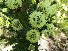 The flowers are arranged in spherical groups of 18 to 32, on the ends of branches which continue to grow after flowering. The flowers are cream-coloured to pale yellow and are surrounded by glabrous, egg-shaped bracts and bracteoles. The floral cup and sepals are each about 1 mm (0.04 in) long and the five petals are egg-shaped to almost round and 2–2.5 mm (0.08–0.1 in) long. There are about 50 to 70 stamens which are about twice as long as the petals and a style about 7 mm (0.28 in) long. Flowering occurs in October and November and is followed by fruit which are urn-shaped capsules about 6 mm (0.2 in) long.[2]