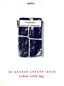 In his conceptual art Lakner applies various methods of artistic transformation of literature as well as language. A major work in 1970 used a book on aesthetics, written by the Hungarian philosopher George Lukács, who signed it for him. Lakner tied it shut using a piece of string. He then placed the laced book on his studio wall, photographed it and then transformed it into a screen printed image.[51] This work (and its novel method of fabrication) was exhibited in 1972 at the Venice Biennale in the International Pavilion. Lakner continued working with this process by lacing other books,[52] as well as creating photorealistic paintings of such situations.