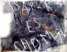 Lakner's guest stay 1981-1982 in New York at MoMA PS1 studio and gallery[65] was significant. Here Lakner experienced the illness and death of a good friend. During this time, he became also aware of graffiti on the walls of houses and in subway shafts. As a result, he painted on large bed sheets, in which individual words or slogans were applied with spray paint. "At that time, the graffiti of the Puerto Rican boys in the streets of New York meant more to me than anything else I saw in museums and galleries." He wanted "Black Milk", the words from Paul Celan's poem Death Fugue, "written big on a wall with a flamethrower."[66] In Isa Pur, Museum Ludwig, Cologne, he cites the oldest Hungarian Funeral Sermon and Prayer written in Latin script: “Behold, we are dust and ashes”. The single letters above the patchy colored ground are created by spray paint, or the paint is scratched away, reinforcing his narrative about life and death.[67][68]