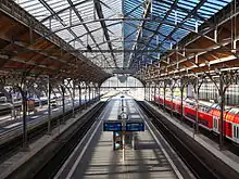 Lübeck Hauptbahnhof (German for Lübeck main station) is the main railway station serving the Hanseatic city of Lübeck, in the German state of Schleswig-Holstein. It is a through station at the western edge of the city centre. With around 31,000 travelers and visitors each day, Lübeck Hbf is the busiest of all the railway stations in Schleswig-Holstein. It is classified by the Deutsche Bahn as a category 2 station.