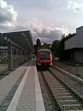The formerly important station building of Lüdenscheid station, which had been built in 1960, was demolished in 2009. Located in this building there was a ticket office, a restaurant and a waiting room. In place of the old station building a four-storey building has been built with a driving school, a newsagent, a taxi company, a bakery and toilets. This will offer rail passengers an attractive waiting room.[8][9] On 27 July 2012, a report appeared in the Lüdenscheider Nachrichten that a new building will be completed in 2013 with a DB service centre, waiting room and toilets for passengers. In addition, there will be apartments for students at the local university and commercial space such as for medical services.[10]