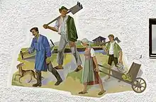 Lüftlmalerei depicting peat workers (1948) 48°11′42″N 11°22′22″E / 48.195064°N 11.372676°E / 48.195064; 11.372676 (Lage)