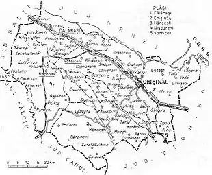 The area county of the county was occupied by the Soviet Union in 1940 and became part of the Moldavian SSR. The area returned to Romanian administration as the Bessarabia Governorate following the Axis invasion of the Soviet Union in July 1941. A military administration was established and the region's Jewish population was either executed on the spot or deported to Transnistria, where further numbers were killed.[2] As the Soviet Union's offensive pushed the Axis powers back, the area again was under Soviet control. On September 12, 1944, Romania signed the Moscow Armistice with the Allies. The Armistice, as well as the subsequent peace treaty of 1947, confirmed the Soviet-Romanian border as it was on January 1, 1941.[3][4] The area of the county, along with the rest of the Moldavian SSR, became part of the independent country of Moldova.