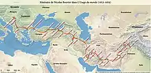The book is an account of the journey made by the two friends from Yugoslavia to Afghanistan, between June 1953 and December 1954 after having received the blessing of Ella Maillart, the Swiss adventurer and travel writer.[1] The route, made in a Fiat 500 Topolino, takes them from Belgrade to Turkey, Iran (where they spend the winter 1953–1954 in Tabriz), Pakistan (including a long stopover in Quetta), and Afghanistan. Here, in Kabul, the two friends split up: Nicolas Bouvier's story continues until Khyber pass, while Vernet travels to Sri Lanka to meet his girlfriend Floristella.[1] The choice of the small Topolino despite being less romantic than going on foot gives L'usage du monde its poetry and a very peculiar rithm.[1] To earn the little money needed during the trip, Thierry Vernet sells paintings and Nicolas Bouvier writes articles for Swiss and other newspapers, gives lectures and French lessons.