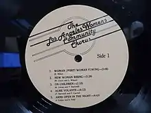 The Los Angeles Women's Community Chorus (LAWCC) was a Los Angeles, California based non-profit group from 1976 to 1990 and performed works written and arranged by women. The LAWCC used their platform to bring awareness about lesbian issues, feminism, and other local issues affecting the gay and lesbian community.[28] The chorus had a steady and consistent group of around 80 women on any given year. These women committed for at least a year and spent numerous hours practicing to develop a professional and talented rapport in Los Angeles and beyond. The LAWCC performed was asked to in a variety of venues such as universities, prisons, conventions, and local union and organizing meetings. An important aspect of their work was being intentional about the community accessing their performances. Their events tended to be sliding scale or donation based, provided childcare, offered Spanish translations and signing for the hearing impaired, and offering braille song books for the blind. The foresight of this non-profit to make their performances accessible for the gay and lesbian community and other Los Angeles communities speaks to their mission of using performance art as a tool for change.[29][30]