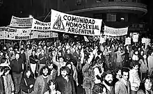 In the late 1960s and early 1970s, the first activist groups of the country appeared, most notably the leftist Frente de Liberación Homosexual (FLH), whose immediate forebear was Nuestro Mundo, the first gay rights organization in Latin America.[2] The arrival of the last civic-military dictatorship in 1976—with its subsequent intensification of state terrorism—dissolved these activist efforts,[3] and the local movement often denounces that there were at least four hundred LGBT people among the desaparecidos.[4] The end of military rule in 1983 was followed by a flourishing of lesbian and gay life in the country which, combined with the continued repression, resulted in a resurgence of activism, within which the role of Carlos Jáuregui and the Comunidad Homosexual Argentina (CHA) stood out.[5]