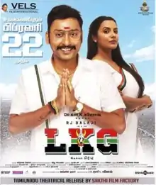 LKG (an initialism for Lalgudi Karuppiah Gandhi) is a 2019 Indian Tamil-language political satire film produced by Ishari K. Ganesh and directed by K. R. Prabhu in his directorial debut.[2] The film stars RJ Balaji and Priya Anand while Nanjil Sampath, J. K. Rithesh, Ramkumar Ganesan and Mayilsamy play supporting roles.[3] Leon James scored music for the film, while Vidhu Ayyanna and Anthony handled the cinematography and editing, respectively.[4][5] The film released on 22 February 2019 to unanimously positive reviews and performed well in the box office.