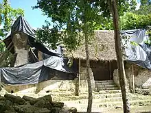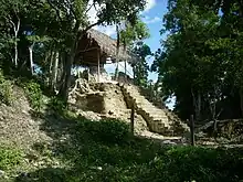 The most important architectural complex is the acropolis, a palace with an enclosed courtyard located within the Great North Plaza.[3] The acropolis is also known as the Quadrangle due to its layout.[9] A series of terraces lead down from the acropolis to a 1,500-square-metre (16,000 sq ft) reservoir to the south, which appears to have been a private water source for the palace.[19] The reservoir itself is now dried out.[8] The acropolis was accessed via a wide stairway from the Great North Plaza.[3] The form of the plaza and the acropolis are unusual, although similar complexes have been identified at Tayasal, Ixlú and Kinal.[3]