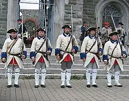 The regiment was recruited in the French region of Lorraine. After recruitment, most of the regiment left from Brest, France aboard a few French ships, such as Le Héros and Le Léopard.[1] The last of the men would arrive in Quebec City on 31 May 1756. They took part in the capture of Fort Oswego in August of that same year, and then escorted the British prisoners to Montreal after the battle. Régiment de la Sarre played a key role in the victory at Fort Oswego losing 7 men in the process.[1] In August 1757, many soldiers of the regiment participated in the victory at Fort William Henry. At Fort William Henry, Régiment de la Sarre contributed 800-900 men of the roughly 5000 who fought in the battle itself. The fort capitulated before they had a chance to launch a full on assault on it. The regiment then served under Louis-Joseph de Montcalm in 1758 at the Battle of Carillon.This victory was absolutely decisive for the French crippling a much larger British force. Régiment de la Sarre also played a significant role in this battle. La Sarre was commanded by de Savournin during the battle. During the Battle, de la Sarre took up the left flank along with the Languedoc regiment. The regiment lost a number of captains during the battle and perhaps took the heaviest French losses during the bloodiest and largest French victory of the war in North America.[1] The regiment then participates in the battles of Montmorency, Plains of Abraham and Sainte-Foy.[2] The Battle at Montmorency was another French victory in which Régiment de la Sarre took part in. Le Noir a captain in the regiment, was noted to be extremely brave in this battle in particular. He lost half of his men and was shot, and still managed to survive. The next battle La Sarre took part in was the decisive English victory at the Planes of Abraham. About 50 men were either injured or killed from the regiment during the battle. The final North American battle which the regiment would take part in was the Battle of Sainte-Foy. This was another victory for the French and La Sarre, which was inconsequential to the outcome of the war. The regiment lined up on the left flank of the French lines. There were signs of retreat on the left, but the regiment fought bravely and held off the English forces for half an hour until the rest of the French army came to its aid. Eventually, La Sarre with the help of the rest of the French army, managed to push the enemy off the battlefield.[1]