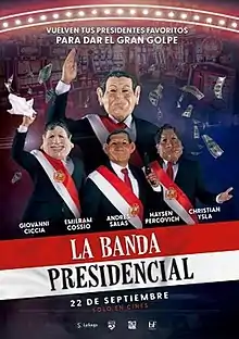 La banda presidencial (lit.'The presidential band') is a 2022 Peruvian satirical crime political comedy film written and directed by Eduardo Mendoza de Echave.[1] Starring Emilram Cossio, Giovanni Ciccia, Andrés Salas, Haysen Percovich and Christian Ysla.[2]