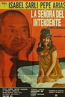 La señora del intendente (The mayor's wife) is a 1967 Argentine comedy film directed by Armando Bó and starring Isabel Sarli and Pepe Arias. The film had a sequel "Una Viuda descocada" (1980), which was Bó's last film.