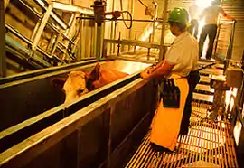 A worker and cattle in a slaughterhouse