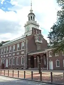 The three-mile-long procession that accompanied Lafayette into the city wound through a dozen temporary triumphal arches that had been constructed for the occasion. Aging veterans of the Revolution had assembled outside the Second Bank of the United States to cheer Lafayette as his coach passed; seeing them he stood and "saluted them most respectfully with three low bows".[9] The parade ultimately terminated at Independence Hall, where a reception was held in his honor.[7][10]