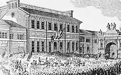 Lafayette and his entourage arrived on the outskirts of Philadelphia on September 27, 1824 and were entertained with an evening ball in Holmesburg, Pennsylvania. They spent the night at the Frankford Arsenal. The next day an enormous, 6,000-man military escort drawn from the Pennsylvania militia was assembled. At 8:00 a.m. a 100-gun salute was fired to Lafayette who was, thereafter, driven at the head of the troops into the city in a carriage drawn by six white horses.[6][7][8] The marquis' secretary, Auguste Levasseur, described the scene in a journal he kept of the tour:[8]