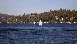 Lake Arrowhead is an artificial lake located in the San Bernardino Mountains on Little Bear Creek, a tributary of Deep Creek and the Mojave River. It has a surface area of approximately 780 acres (320 ha) and a capacity of 48,000 acre⋅ft (59,000 dam3).[1] It is surrounded by the unincorporated community of Lake Arrowhead in San Bernardino County, California.