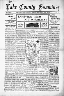 It was created by the Oregon State Legislature in 1874, and founded by Charles A. Cogswell and Stephen P. Moss in 1880. The town of Lakeview was established two years later and became the county seat for Lake County. It was started as a weekly newspaper published in Lakeview. The newspaper's first editor was Frank Coffin.[9][10][11][12]