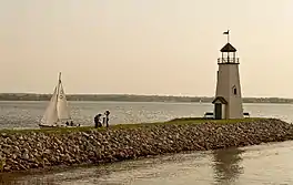 The lake is situated within the Oklahoma City urban area and is subsequently closely bordered by residential areas to the north, west, and east. The Lake Hefner Dam is located along the entire northern side of the lake (with Bluff Creek Park being located below the dam, on the other side of Hefner boulevard). Lake Hefner Parkway borders the east side of the lake, with some commercial development (including restaurants, bars and office buildings) located alongside the lake, as well as a 36-foot tall working replica of the second oldest lighthouse in the United States, the Brant Point Light near Nantucket, Massachusetts.[6] The south side of the lake is the least developed, retaining the original forest along much of the shore. Lake Hefner Golf Course is located on the southwest corner of the lake. Immediately south of this are the Oklahoma City docks, commonly known as the city-side docks, the largest marina on the lake. The other marina on Lake Hefner is the Oklahoma City Boat Club (OCBC), a private organization that holds weekly sailboat races during the summer and is located on the east side. Just north of the OCBC is the East Wharf area, which contains several fairly upscale restaurants. On the south side of the lake is the Hobie Point, a YMCA sailing school, and Stars and Stripes Park. Stars and Stripes Park also has new additions of a Fitness court and a Skatepark. The Oklahoma Radio Kontrol Society (TORKS) has maintained a Radio Control air field since the early 1970s.