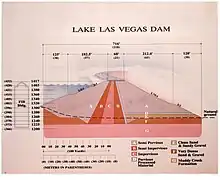 The earthen impoundment that forms the reservoir is 192 ft (59 m) tall, 4,800 ft (1,500 m) in length, and 716 ft (218 m) wide at its base. It contains roughly the same amount of dirt as Hoover Dam does concrete, and impounds 10,000 acre-feet (12,000,000 m3) of water.[1][5] Since the reservoir was built in the channel of the Las Vegas Wash — the valley's only storm runoff outlet — A bypass was built for the wash beneath the reservoir and dam allowing it to remain connected to Lake Mead via two 84-inch (2.1 m) diameter pipes.[6][7] The bypass is a flood control measure, allowing flood waters to be diverted under the reservoir into Lake Mead with the rest absorbed by Lake Las Vegas itself.[8] After falling into substantial disrepair, the pipes — which are owned by the city of Henderson, but maintained by the resort — were repaired in 2009 at a cost of $3 million.[8]