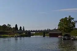 Lake Leelanau was a major impediment to east-west travel since this area was first settled in the mid-1800s.[2] A wooden bridge was erected over the narrows in 1864; a replacement metal truss bridge was constructed in 1894–1895. In 1939, the Michigan State Highway Department decided to replace the aging truss bridge to help support the local tourist economy. They built this new bridge about 200 yards north. The bridge project was part of the Federal Emergency Administration of Public Works, which provided jobs in the Great Depression through funding public infrastructure projects.