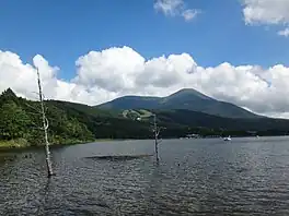 The Venus Line road opened in 1967 and connected the lake to Lake Shirakaba, which was a more established tourist destination.[1] Seizing the opportunity, Tateshina then got a licence to use the surface of the lake and further developed the lake as a tourist attraction, building several accommodation and leisure facilities,[2] In the area around the lake there natural woods of Japanese white birch and Japanese larch,[1] and in spring and early summer one can see eastern skunk cabbage and Japanese azalea at their peaks, respectively.[3] Boats can be seen on the lake in summer, and in August the Shirakaba Kōgen Firework Display is held.[4] The red leaves of autumn have also been praised for their beauty.[4] In winter, the frozen lake surface is turned into a race track, which is used to hold courses in road safety as well as to test drive cars in development.[5]