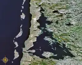 The western shore is guarded by the steep ramparts of sedimentary rock that rise abruptly out of the brackish waters. This unusual coastal relief of asymmetrical hills are the Hudsonian Cuestas and the highest system of cuestas found in Quebec.[6] There is only one narrow breach in these fortifications at the extreme southwest end, called "Le Goulet" (French meaning "narrows" or "bottleneck"), which is a cataclinal valley 5 kilometres (3.1 mi) long, 300 to 600 metres (980 to 1,970 ft) wide and fringed by cliffs 200 metres (660 ft) high.[6] A large volume of water surges through it with the rise and fall of the tides, creating water level differences of about 0.5 metres (1.6 ft).[1] Consequently, this passage does not freeze in the winter.