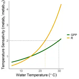 Temperature sensitivity of gross primary production (GPP) and respiration (R) based on average activation energies reported in Yvon-Durocher et al. (2012).[5] As water temperature increases, R increases more rapidly than GPP due to the higher average activation energy for R. In this figure, GPP and R temperature responses are reported as relative to GPP and R rates at 15°C. A doubling of metabolic rates compared to metabolic rate at 15°C (horizontal dashed line) occurs with just a 7.6°C increase for R but requires a 14.8°C increase to double GPP.