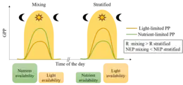Conceptual figure of the effects of mixing and stratification dynamics on gross primary production (GPP) in two different situations: one with light-limited primary production (PP) and other with nutrient-limited PP.