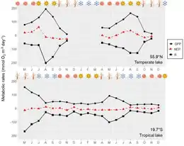 Most of the lakes in the world freeze during the winter,[53] a low-irradiance period, in which ice and snow cover limit light penetration in the water column. Light limitation occurs mainly by snow cover and not by ice, which makes primary production strongly sensitive to snow cover in those lakes.[54] In addition to light limitation, low temperatures under ice also diminish metabolic rates, but not enough to cease metabolic processes. Therefore, the metabolic balance is usually negative during the majority of the ice season, leading to dissolved oxygen depletion. Shallow lakes in arid climates have none or very little snow cover during the winter, thus, primary production sustained under-ice can be enough to prevent dissolved oxygen depletion, as reported by Song and others[54] in a Mongolian lake. Despite the high proportion of the world's lakes that freeze during the winter, few studies have been conducted on lake metabolism under-ice, mostly due to sampling technical difficulties.[53][55][54] Lakes that are closer to the equator experience less seasonality regarding light intensity and daylight hours than lakes at higher latitudes (temperate and polar zones). Thus, lakes at higher latitudes are more likely to experience light limitation of primary production during low-light seasons (winter and autumn). Seasonal differences in temperature are also not so important in the tropics as they are for higher latitudes lakes. Thus, the direct effect of temperature seasonal variations on metabolic rates is more important in higher latitudes lakes than in tropical lakes (Figure). In turn, tropical and subtropical lakes are more likely to have seasonal variations following the stratification and mixing dynamics, and rainfall regimes (wet and dry seasons), than due to the four astronomical or meteorological seasons (spring, summer, autumn, and winter) when compared to higher latitudes lakes.