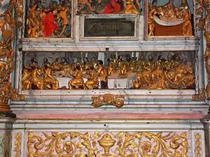 This altarpiece dates to the 17th century. In the top right hand section there is a depiction of Saint Miliau, the patron saint of Guimiliau, and below a scene showing his martyrdom when he was beheaded by his brother Rivode. The left hand side has an image of the bishop of Léon and below that a depiction of the Virgin Mary's birth. The central section was supplied by an Antwerp workshop and in eight magnificent tableaux, the sculptors have created 80 images representing the story of the passion. At the very bottom the scenes presented are of the Last supper and Jesus washing the disciples' feet and in the other sections, we see representations of Judas' kiss, the flagellation, Jesus carrying the cross, the descent from the cross, the entombment and the altar of the passion itself.