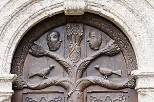 This building dates to 1667 and is attributed to G. Kerlezroux. The motto "Memento mori" is written above the ossuary door, contrasting with the fine carving of the Tree of life on the door itself; the sculptor juxtaposed images of life and death. Inside the ossuary there is an altarpiece depicting the resurrection with a depiction of the "Risen Lord" with Saint Sebastian to the left and Saint Roch on the right. Also to the left of the altarpiece are statues of Saint Anne and the Virgin Mary and on the right a statue of Saint Pol and the dragon. The "Mise au Tombeau" or Burial of Jesus, shown in the photographs which appear later, was originally in the ossuary, but was subsequently moved to the church. Above the door there is also a sculpture of a man's head: he gingerly strokes his beard. Thus in its overall imagery, the ossuary deals not just with death but life and resurrection.[5]