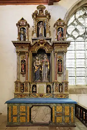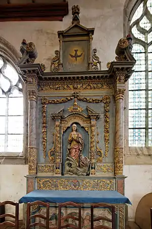 This was designed by G. Carquain in the 17th century and shows Saint Anne with the Virgin Mary in the centre. On the right of this is a depiction of Saint Joseph, and on the left Saint Joachim. Top left is Saint Barbara, top centre a bishop and top right Saint Marguerite. Along the bottom of the altarpiece, and from left to right, we have a depiction of the "rich", then Saint Yves followed by Saint Hervé and Saint Cadou.