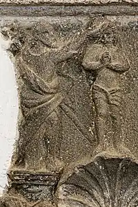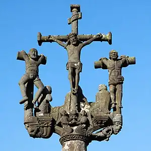 The Lampaul-Guimiliau parish close boasts two calvaries. One, carved from kersanton stone, dates to the 16th century and is placed on top of the triumphal arch, the entrance to the enclosure, which dates to 1668 and comprises the central cross with gibbets on either side bearing the penitent thief and the impenitent thief. The central cross measures 4 metres in height. There is a statue of Mary Magdalene at the base of the cross and on the ornate crosspiece are back to back statues of Saint Peter and Saint John the Evangelist and Saint John with Saint Paul. The second calvary is 5.5 metres high and comprises a single shaft at the top of which is a Jesus is crucified with the two thieves on gibbets on either side. On the reverse of Jesus is a pièta, sadly much mutilated, although it was restored in 1993. Below Jesus are two small angels holding a chalice in which they have collected his Blood and under the bad thief there is a depiction of a demon ready to whisk his soul off to hell. Beneath the good thief, the depiction of an angel promises his soul a better fate.[4]