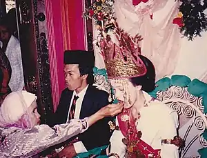 A Lampung bride and bridegroom in 1987. Both of the couples are of the Sungkai Bungamayang clan. The traditional headgear of the bride, which is called Siger, is commonly used in Lampung weddings.