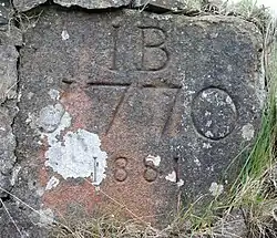 The Annick Water lies to the south of the lands of Blacklaw with a bridge (NS465494) carrying a datestone on the upstream side with the initials 'I.Brown' and the dates 1770 and 1881 implying construction and later renovation although the style, execution and weathering of the carving on soft sandstone suggests that the dates, etc. are contemporary with each other and therefore the actual carving is no older than 1818. The 'I' stands for Iohannes which is now written as 'John' and the surname indicated the Brown family, originally of Gabrochhill where they had resided for many generations.[1] The date '1770' has an odd first numeral shaped almost as a 'J'. The bridge is constructed of whinstone, wide enough for horse-drawn vehicles and has mostly lost its low side walls. The datestone is not located as a keystone on the arch of the bridge and therefore could have been inserted at any time, in addition, as stated, it is made of red sandstone.