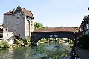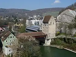As a counterpart to Stein Castle, the count's administrative seat, the Niderhus was built on the opposite side of the river in the 12th century, first mentioned in 1265 as "Lower Fortress" (Niderhus).[2] Initially, servants of the Counts of Lenzburg lived there. The building came into the possession of the Counts of Kyburg through inheritance in 1173. In 1264, the Habsburgs took over the management of the building, and nine years later they owned it entirely. When the city fortifications were expanded around 1360, the Niderhus was included as a bridgehead in the fortifications. Access to the bridge was through an archway, a wall led from the building to the Lägernkopf and thus completely sealed off the passage on the right bank of the Limmat.[3][4]
