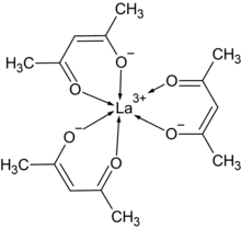 Lanthanum acetylacetonate is a coordination compound with the chemical formula La(C5H7O2)3, or abbreviated as La(acac)3. Its instability constants (logYn) are 3.65, 5.13 and 6.12 (corresponding to n=1, 2, 3).[2] It can be prepared by the reaction of lanthanum alkoxide and acetylacetone.[3] Its tetrahydrate decomposes into monohydrate at 110 °C, obtains the anhydrous form at 150 °C, undergoes La(CH3COO)(acac)2 and La(CH3COO)2(acac), and at 180~285 °C lanthanum acetate is produced.[4] It can be used to prepare NaLaS2, La2Zr2O7 and other materials.[5][6]