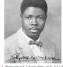 2. Adeloye (1975). "E. Latunde Odeku, M.D., F.A.C.S., F.I.C.S., 1927-1974. An African pioneer neurosurgeon". Journal of the National Medical Association. Journal of National Medical Association. 67 (4): 319–320. PMC 2609380. PMID 1099223.