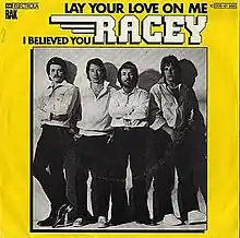 "Lay Your Love on Me" is a pop song by the British pop group Racey; it was their second single release. The song was written by Nicky Chinn and Mike Chapman, produced by Mickie Most and released in 1978 on the RAK Records label. It was their first hit single, reaching No.3 in the UK Singles Chart,[1] and No.2 in Ireland in December 1978. It was a No.1 hit in the Netherlands, Australia and New Zealand later that same year.