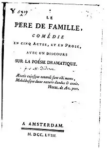 Le Père de famille (English: The Father of the family) is a 1758 play by Denis Diderot. In this play, Saint Albin, a young man, falls in love with Sophie, a poor young woman of unknown parentage. His father, the title character, is against the match, and his uncle actively plots against it by trying to force Sophie into a convent. Against her better judgement, Cécile, Saint-Albin's sister, hides Sophie in their home at the behest of Germeuil, a friend of the family. When the father discovers the disobedience of his children, he is dismayed; and the entire situation is exacerbated by the ill-intentioned uncle. When the uncle is confronted by the young woman in person, however, he realizes that she is his niece. With the question of her parentage solved, Saint-Albin is free to marry Sophie, Cécile is free to marry Germeuil, and the father welcomes all his children with open arms.