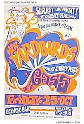 ![]() Poster for Led Zeppelin's concert at the University of Surrey (billed as "The New Yardbirds featuring Jimmy Page"), used to help promote its 1968 U.K. tour | |