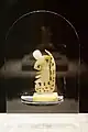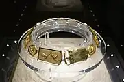 The former was placed in the earthly palace and contained a gold vessel wrapped in a thin gold sheet in the form of a coffin, the details of which are unknown as it was not opened, and was believed to contain the relics of the Buddha's bun hair; the latter is thought to have been placed in the heavenly palace and a gourd-shaped gold vase, which also contained the relics, was suspended inside the tower.[11][28]