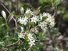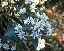 Leionema elatius, commonly known as tall phebalium,[2] is a shrub species that is endemic to New South Wales and Queensland in Australia. It has glossy green, variably-shaped leaves and clusters of white-lemon flowers in spring.