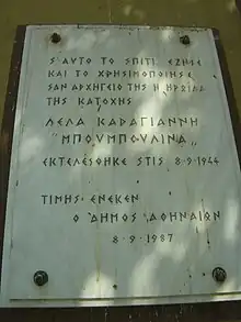 In July 1944, Karagianni was arrested in Athens by the German occupation forces. She was taken to the SS headquarters on Merlin Street, known to some Greek prisoners as "Hell House".[5] There, she was tortured for several days before being sent to Haidari concentration camp on the outskirts of Athens. While interned, Lela continued to coordinate a resistance effort against the Germans. However, she and other captured resistance members were executed by firing squad on the morning of 8 September 1944, just 34 days before Athens was liberated by Allied forces.[1][3]