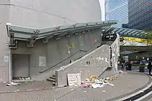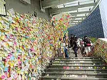 Lennon Wall (Chinese: 連儂牆; Jyutping: lin4 nung4 coeng4), in the Hong Kong context, originally referred to the mosaic wall created during the Umbrella Movement,[1] located at Central Government Complex, Harcourt Road, Admiralty. The wall is one of the major artworks of the Umbrella Movement as a collective artistic work of spontaneous free expression, demanding democracy in the elections of the territory's top leaders.