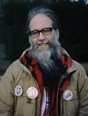 ![]() Len Tower wearing League for Programming Freedom and "No Smoking" badges (c. 1996) | |