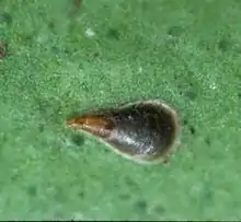 Lepidosaphes beckii also known as purple scale, mussel scale, citrus mussel scale, orange scale, comma scale and mussel purple scale[2] is a scale insect that is a pest of Citrus trees. The small insects attach themselves to leaves, fruits and small branches and cause injury by sucking the tree's sap.[3]