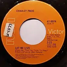 "Let Me Live" was released as a single via RCA Victor Records in April 1971. It was Pride's sixteenth single released in his music career. "Let Me Live" was actually the B-side on the single release. "Did You Think to Pray" was the original A-side but was not played as heavily at radio.[4] It spent a total of nine weeks on the Billboard Hot Country Songs chart and peaked at number 21 on the list in May 1971.[5] The song was Pride's first gospel recording (and only to date) to become a hit on country radio. It was also his first single to miss the country top ten since 1967.[4] In addition, it also became a hit in Canada, also reaching number 37 on the RPM Country Singles chart in 1968.[6] It was later released on Pride's 1971 gospel album, Did You Think to Pray.[1]