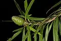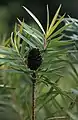 The shrub grows 6 m (20 ft) tall and flowers from September to December. The plant dies after a fire but the seeds survive. The seeds are stored in a toll on the female plant and fall to the ground after a fire, possibly spreading by the wind. The plant is unisexual and there are separate plants with male and female flowers, which are pollinated by the wind.