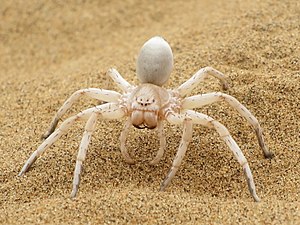 Leucorchestris arenicola, commonly called the dancing white lady spider, is a huntsman spider in the family Sparassidae and genus Leucorchestris. It is commonly found in the Namib desert of Namibia. It is often mistaken with the similarly named Carparachne aureoflava, or more commonly known as the wheel spider from the same location.[1][2] L. arenicola relies on seismic vibrations, called drumming, for communication. It taps its foremost legs on the sand to send messages to other white lady spiders. Male L. arenicola will travel over 50 m in one night searching for a mate. If they find a mate, they must be extremely careful, for drumming the wrong message can be deadly.[1] One of the major features that characterizes its nocturnal behavior is its specialized vision, using eight eyes in different orientations to capture a panoramic view of the surroundings. L. arenicola spiders use temporal summation in order to be able to see dim lighting during night-time wanderings.[3] The species was first described by Reginald Frederick Lawrence in 1962, who described all the species in the genus Leucorchestris.[2]
