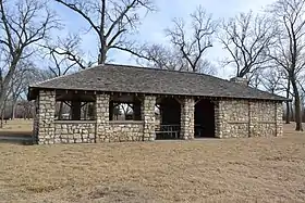 The Sugar Lake State Park Open Shelter was built in 1934 by a Civilian Conservation Corps company who encamped briefly at the park. It is a stone picnic shelter on a poured concrete foundation.[6] The shelter was listed on the National Register of Historic Places in 1985.[7]